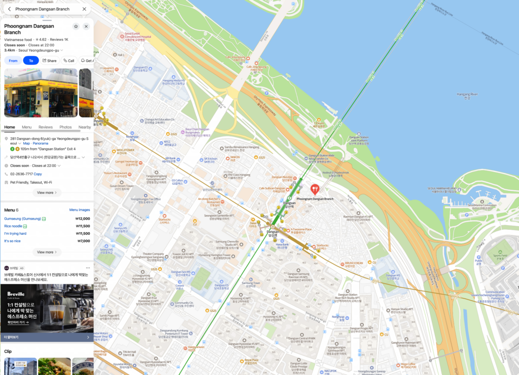 Vietnamese condensed milk coffee is something I can never skip. After finishing your meal, you can grab a cup to go. Just outside the restaurant, there’s a tunnel that leads directly to the Han River Park. It’s a great spot to enjoy your coffee while taking in the river view. One small inconvenience, though: there are no trash bins outside the shop, so you may have to carry your empty cup with you until you find a place to dispose of it.